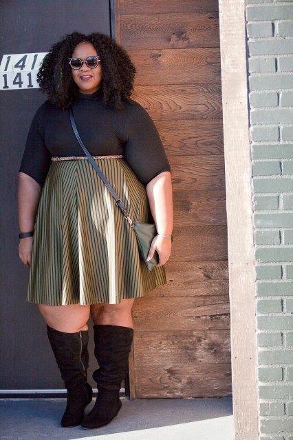 | Glasses and Skirt – Runway Boutique, Boots – Jessica London, Top – Target |