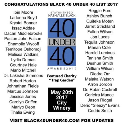 I cannot thank you enough for your votes! Because of you, I’ve been voted in the 2017 class of Stay on the Go Magazine’s, Nashville Black 40 Under 40! Taking a look at this wonderful list of recipients, I’m happy to be in the number. From writers, to doctors, to politicians, this year’s class is filled with the best of Nashville’s talent.