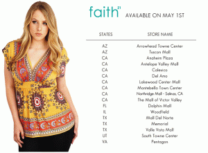 The following is a list of where you can find Faith 21 – Forever 21’s Plus size line (Arizona, California, Florida, Illinois, Texas, Utah, and Virgina). You can also order the whole collection on-line. Word to wise – the Faith 21 runs a bit small, the largest size is 2x. Technically, Faith 21 is considered a junior plus line.