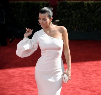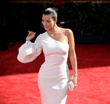 Kim Kardashian models her mod off the shoulder Ina Soltani ivory gown. She looks so beautiful!