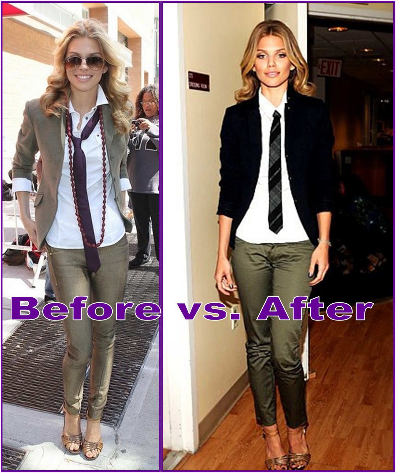 I chose this picture becuase I wanted you to see the power of a wardrob stylist. 90210 star AnnaLynne McCord, rocked menswear chic on her recent visit to The David Letterman Show. She kept the jeans and sandals the same and swithced out the tie and blazer for a plaid tie and navy cardigan. I love it!