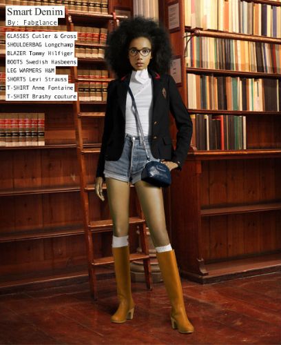 Lastly, the super fashionista, shown above, isn’t afraid to show a little leg in the library. You know the rule, if you expose one area of the body, the other has to be covered for balance. I am so loving the clog inspired knee boots with slouchy socks it’s such a cozy looking combo. Then the preppy Tommy Hilfiger jacket and blouse add that extra fashion factor. Very fab.