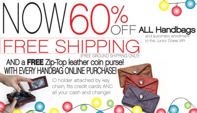 Just in time for Christmas purchases, Junior Drake is offering 60% off all bags, free ground shipping, AND a free leather coin purse with every online purchase.