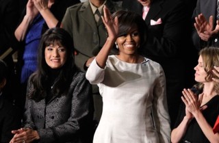 The First Lady is wearing Rachel Roy. We love this sophisticated, yet soft look for Michelle.