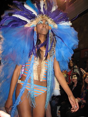 Now, T. Rains was the SHOWSTOPPER! Designer, Traver Rains, formerly of Heatherette debuted his line at Fashion Week. One could only describe T. Rains as cowboys and Indians a la couture. There were feathers, cowboy hats, graphic t-shirts, plaid, and lots of tulle. Rains brought the fun that I expected from Betsey Johnson. When the last model appeared, adorned in a LARGE blue chiffon Native American inspired headdress, the crowd erupted with delight. T. Rains stole the show!