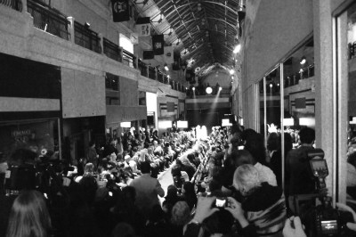 We started the night at the Rymer Gallery for cocktails and conversation. Sitting in the warm gallery (across from the Arcade) we watched the line form down Fifth Avenue as glam fashion followers waited eagerly to enter the space to watch the nights events. Truly, the weather was fierce. Mother Nature decided to blast winter weather winds in our direction as the temperature dipped to a brisk 35 degrees. Anything for fashion, I thought, as I waited for the show to start.