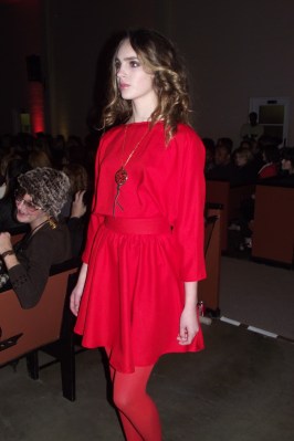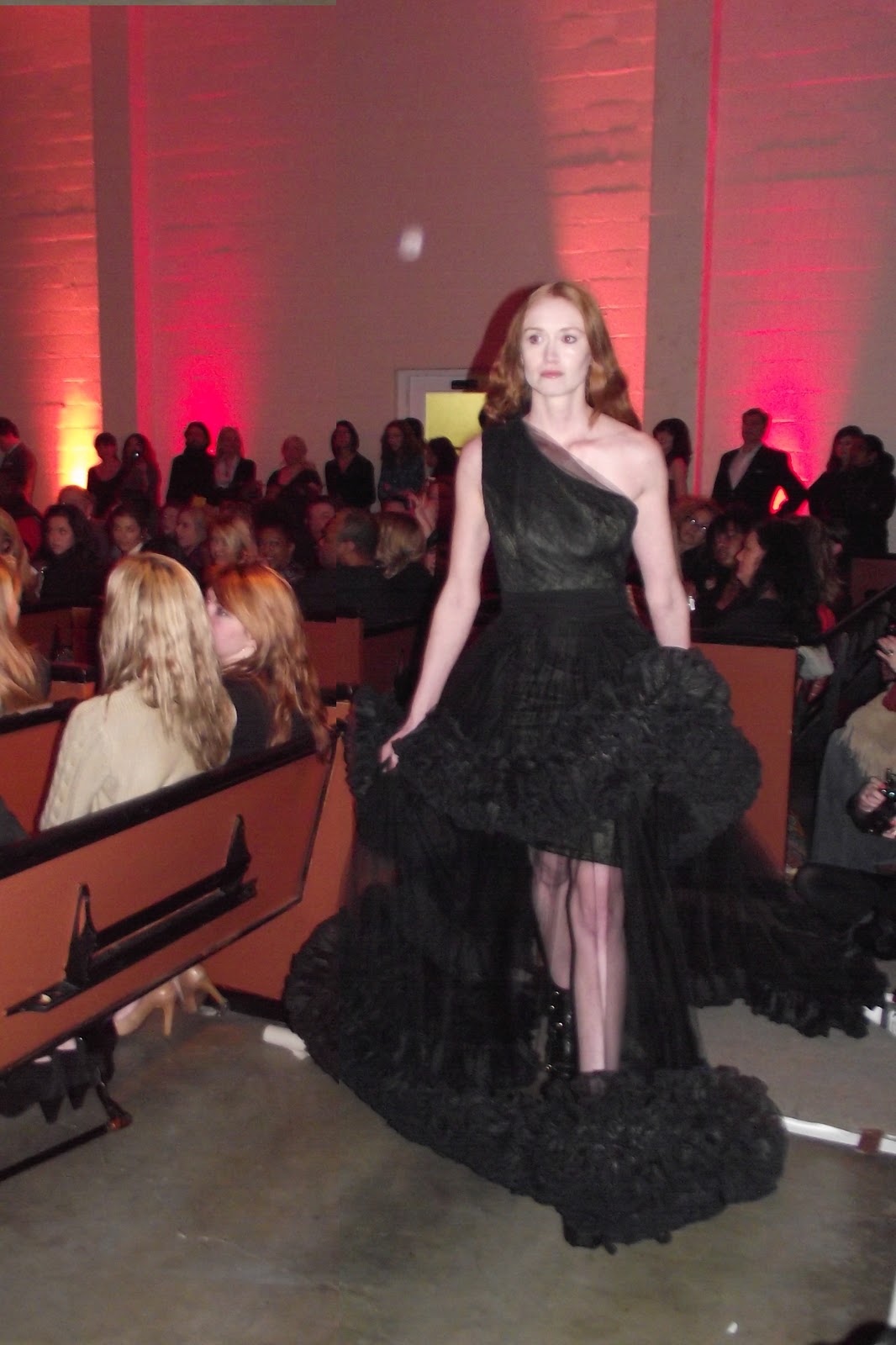 The red dress and red stockings shown above were my favorite ensemble of the night. This design belongs to White Rabbit by Shea Steele. Shea is the owner of Local Honey boutique in Nashville. Her who line was wonderful. I loved that accessories worn by the models to help create the looks. Models wore opaque tights, berets, long necklaces with red flower ornaments hanging. The crowd reaction was great as we warmed up for Christian Siriano.