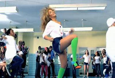Now, let’s talk about Beyonce’s ‘work-out’ attire for the video. She wore a cropped white t-shirt, cut-off jean shorts, American Apparel knee-high socks, and patent leather multi-color Christian Louboutin lace-up booties. Only Beyonce can wear 5 inch pumps while dancing. She looked good though.