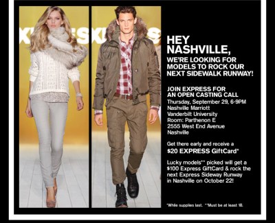 Be sure to get to the Nashville Marriott at Vanderbilt (2555 West End Ave) at 6p to start the process. Some lucky registrants will receive a $20 Express giftcard just for coming to the casting. Models chosen for the show will receive a $100 giftcard.