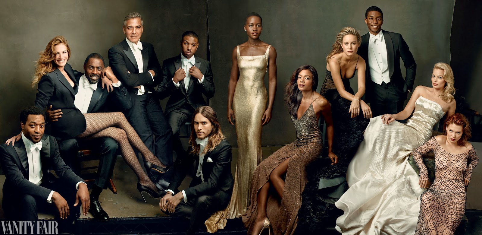 For the 20th annual Vanity Fair Hollywood Issue, the magazine celebrates a year of spectacular film with a group of distinguished actors. The cover, a three-panel foldout by Vanity Fair contributing photographer Annie Leibovitz, features Oscar nominees Julia Roberts (August: Osage County), Chiwetel Ejiofor (12 Years a Slave), Jared Leto (Dallas Buyers Club), and Lupita Nyong’o (12 Years a Slave), as well as Idris Elba (Mandela: Long Walk to Freedom), George Clooney (Gravity), Michael B. Jordan (Fruitvale Station), Naomie Harris (Mandela: Long Walk to Freedom), Brie Larson (Short Term 12), Chadwick Boseman (42), Margot Robbie (The Wolf of Wall Street), and Léa Seydoux (Blue Is the Warmest Color).