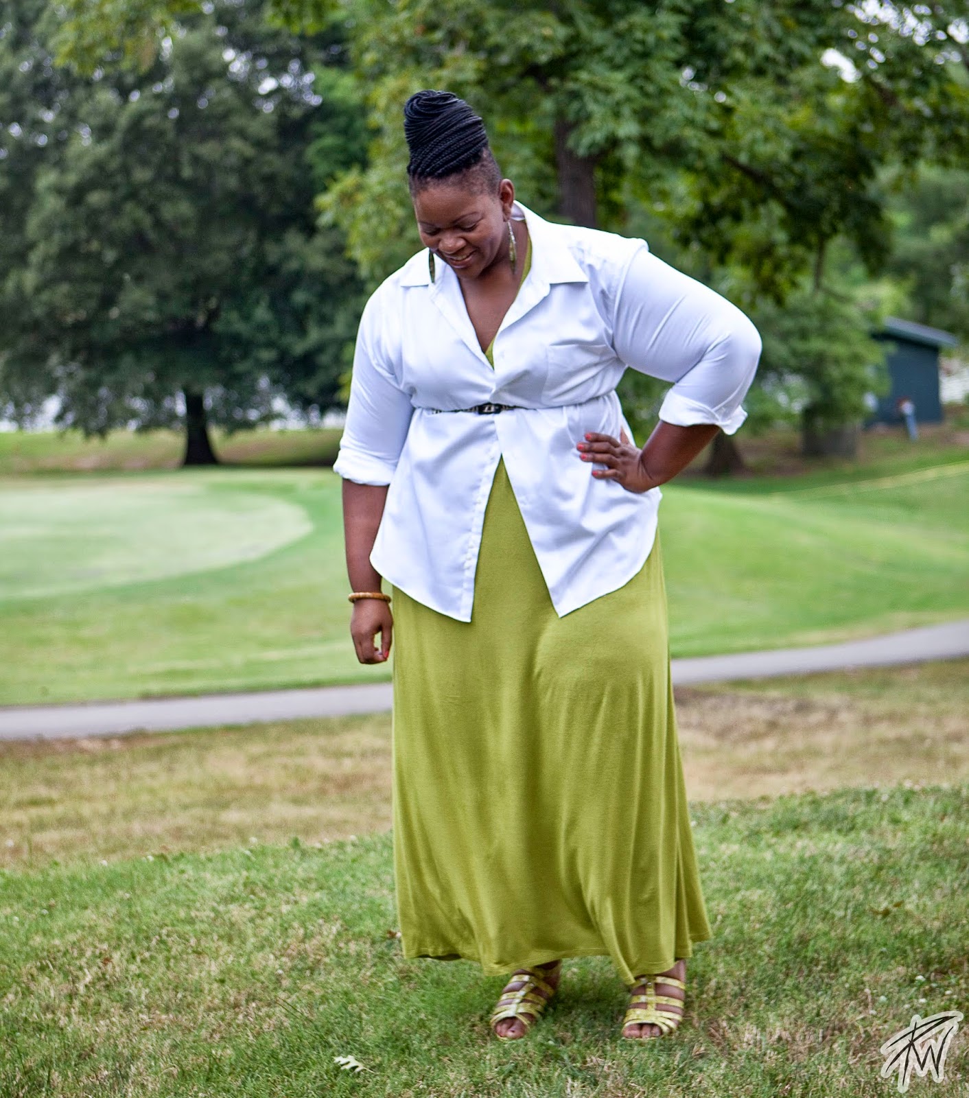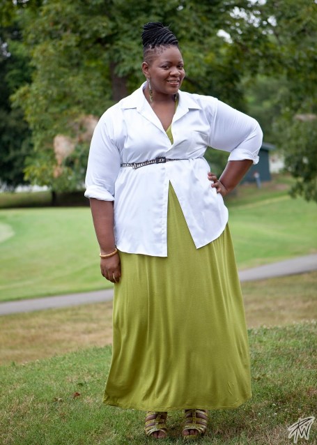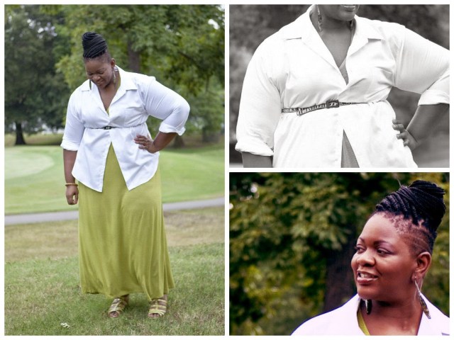 I purchase this simple button down shirt from the men’s department at WAL-MART! I know, RIGHT! This maxi-dress was purchased from Ashley Stewart about 4 years ago (purchase a similar and BETTER one here). The belt was purchased from Target. I love a good slim belt to add a bit of chic to a look. Also, it pulls in your waist and gives that hourglass shape.