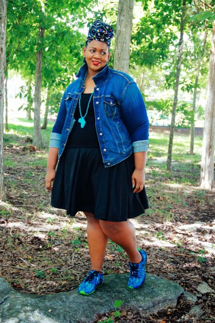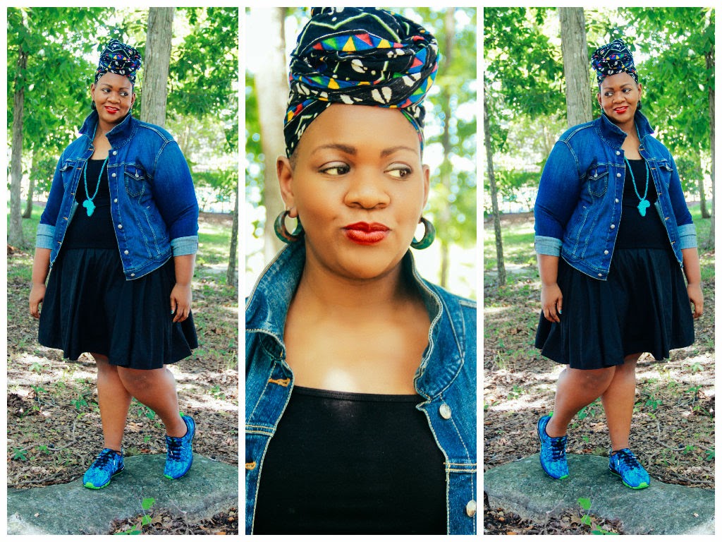 Mixing vintage and classic look, I achieved this comfortable yet sporty look by adding this turban, a trend for some, but part of my Sierra Leone heritage. I added one of my favorite camisoles from Torrid, and this swing skirt from Ashley Stewart. Then, a denim jacket pulls the whole hipster, urban, sporty look together. I mean I just like it.