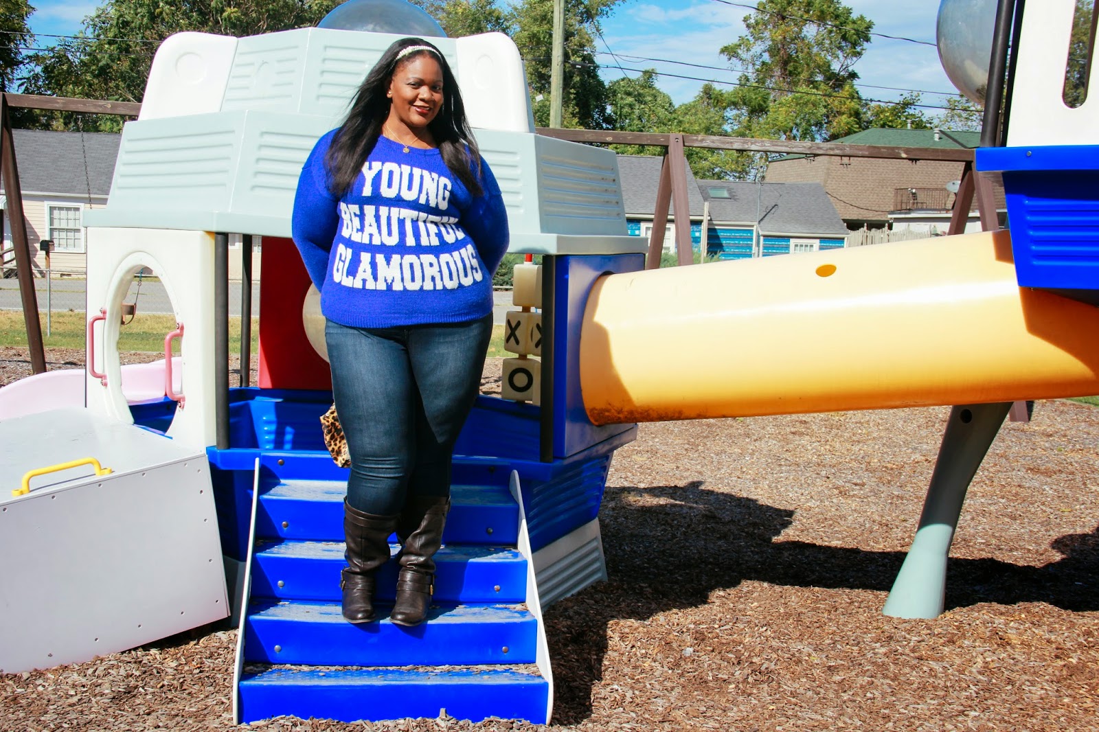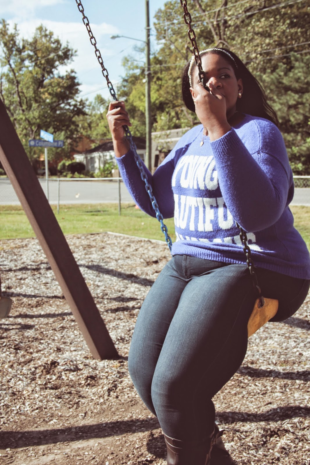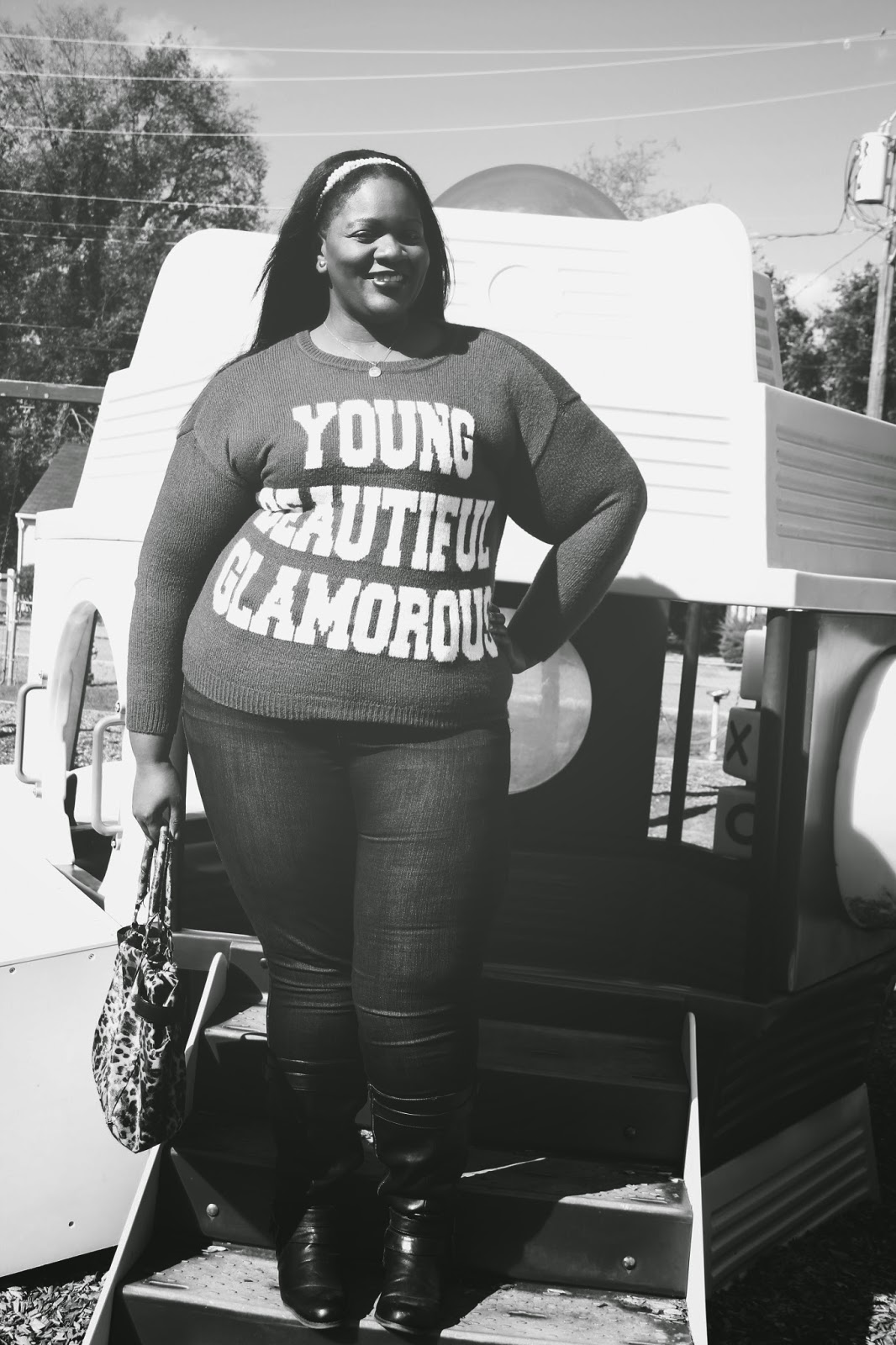 DETAILS: ‘Young, Beautiful, Glamorous’ sweater – Forever 21, Jegging – Torrid, Boots – The Avenue, Bag – ASOS.com – Photographer: Toni Denisa