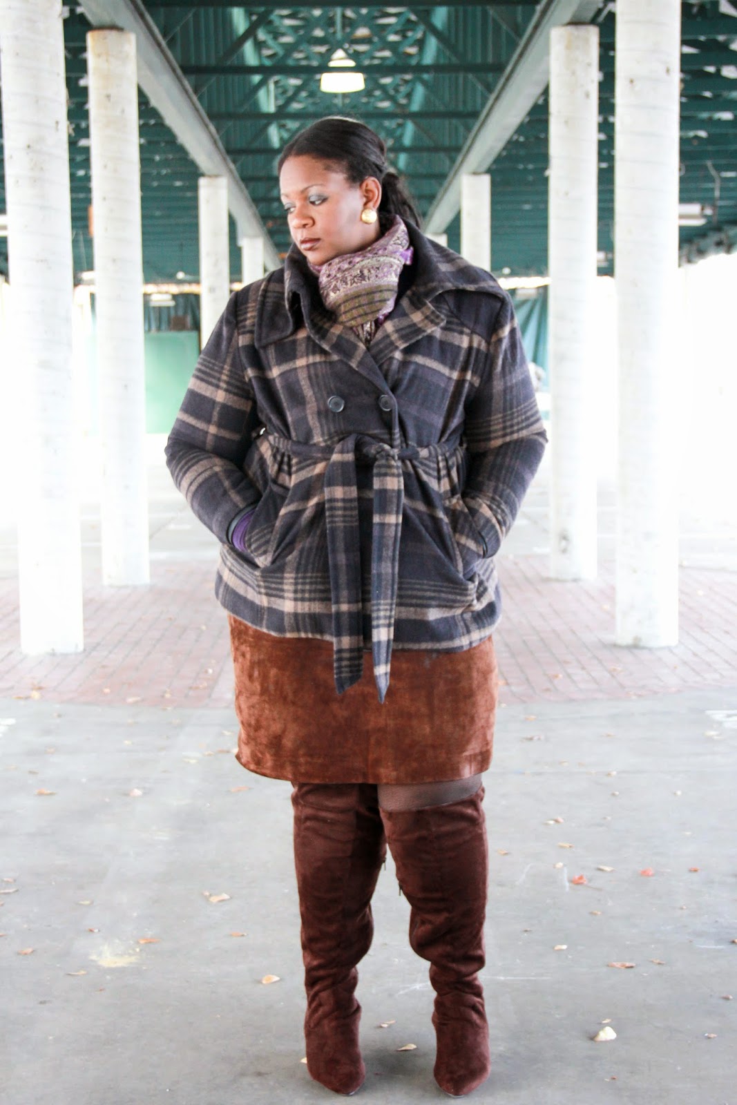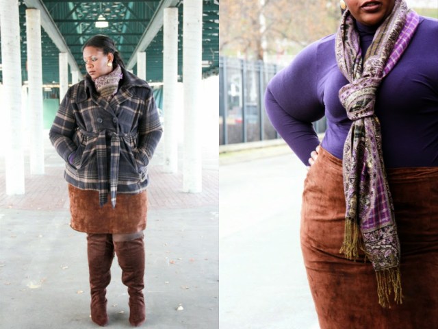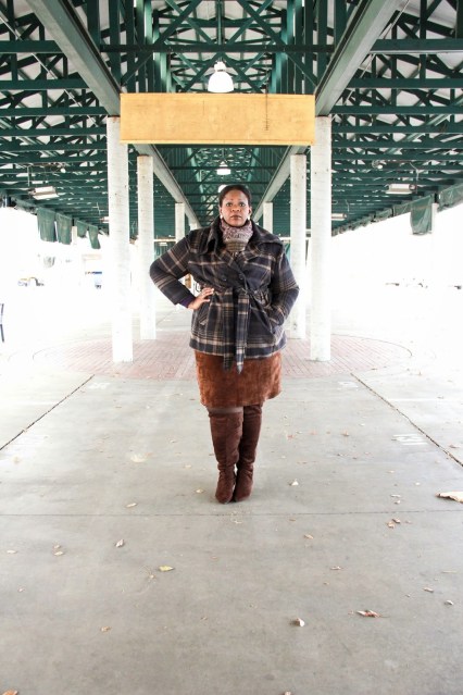 | Coat – Avenue (similar), Shirt – Target, Skirt – Goodwill, and Boots – Jessica London. |