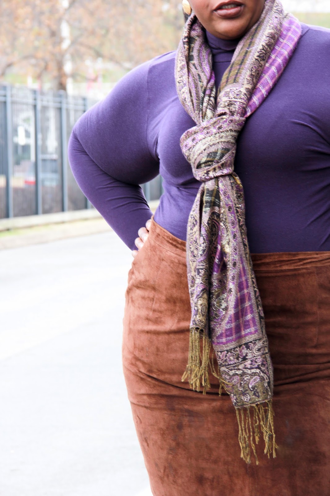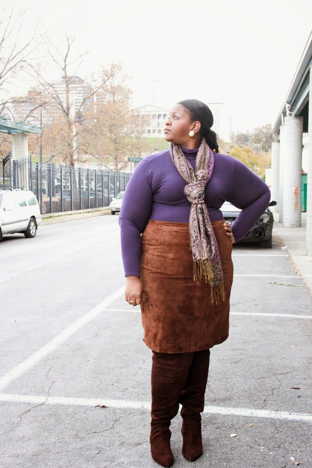 This wonderfully warm, yet lightweight coat, was purchased from the Avenue. It’s a peacoat/trench mix that so fashionably convertible. The suede skirt was a STEAL at the Goodwill. I actually purchased two suede skirts for less than $30. I’ve had this skirt for about 5 years. Of course, these boots, gifted to me from my mom, are super cozy and plenty warm. Find a similar pair at Jessica London (wide with AND wide calf).