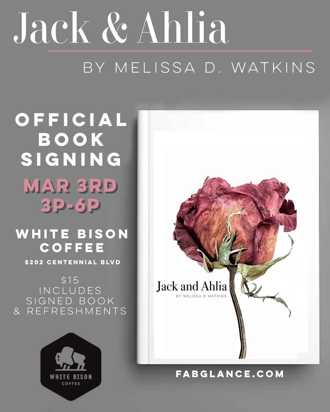 Lastly, I hope you’ve purchased your ticket to the OFFICIAL Jack and Ahlia Book-signing! Yes, I’m hosting a book-signing to discuss the book, sign copies, and network with the Fabglance family. Your ticket includes a signed book and delicious coffee and treats from White Bison Coffee. I cant wait to meet you!