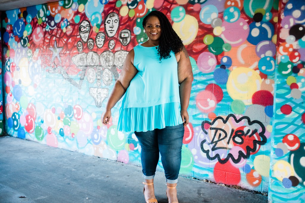When my photographer, Christy, asked me where I wanted to shoot this month’s Jessica London style photos, I picked this amazing location in West Nashville. It’s filled with murals commissioned by the Nashville Walls Project. We stumbled across this selection filled with COLORFUL bubbles. This mural makes you pay attention. This murals asks you, “does your presence make the world more colorful?”