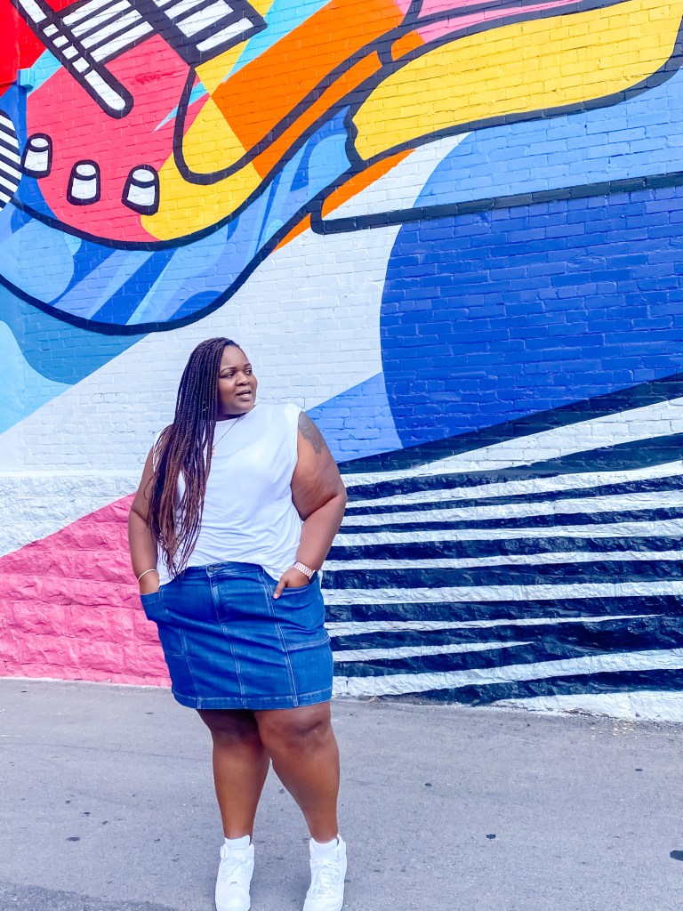 So I scoured the Internet to find a chic muscle tee/padded shoulder tank. Unfortunately, I’ve yet to find a true plus-size version. BUT I discovered a trick to give the illusion of a muscle tee (sans shoulder pads).