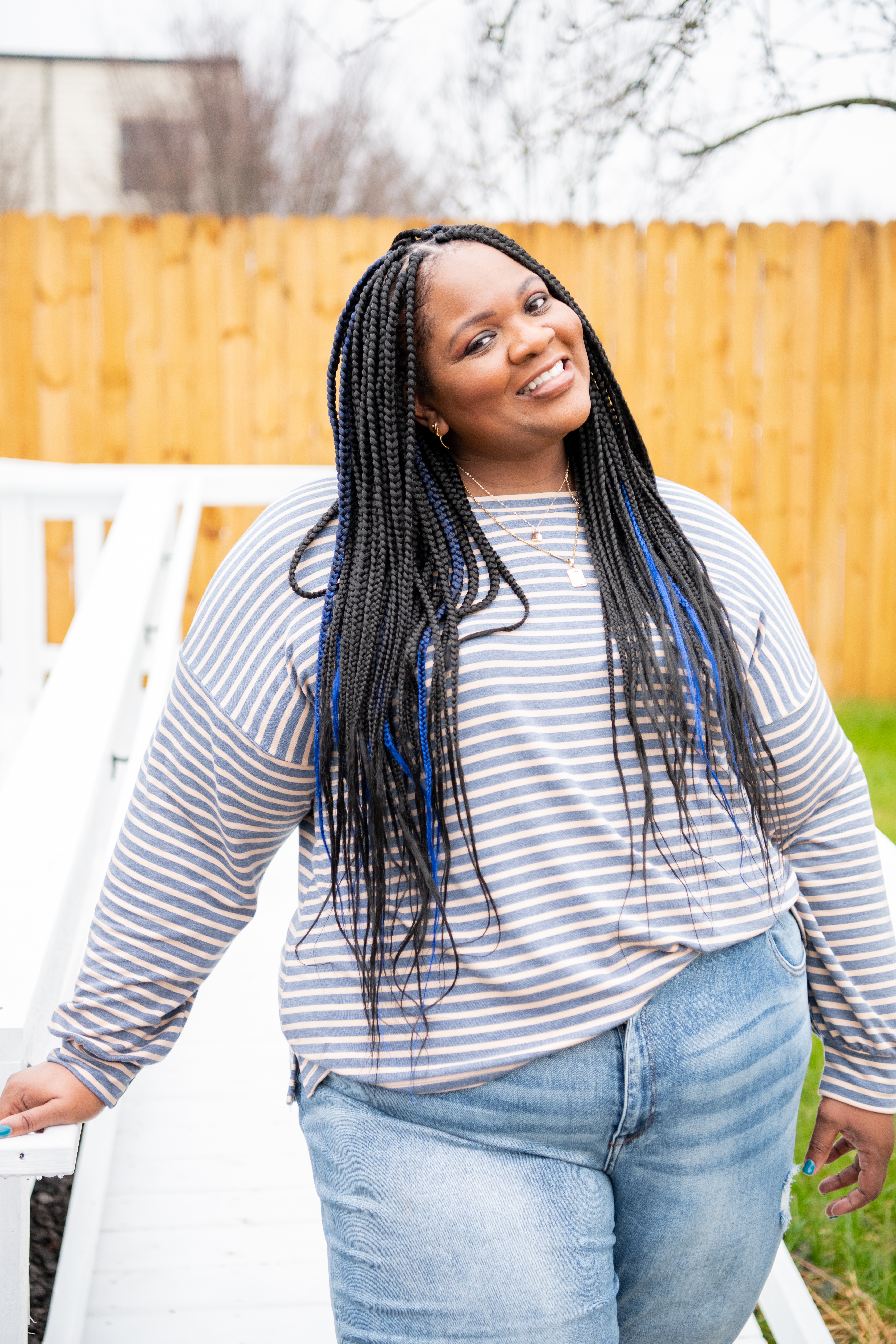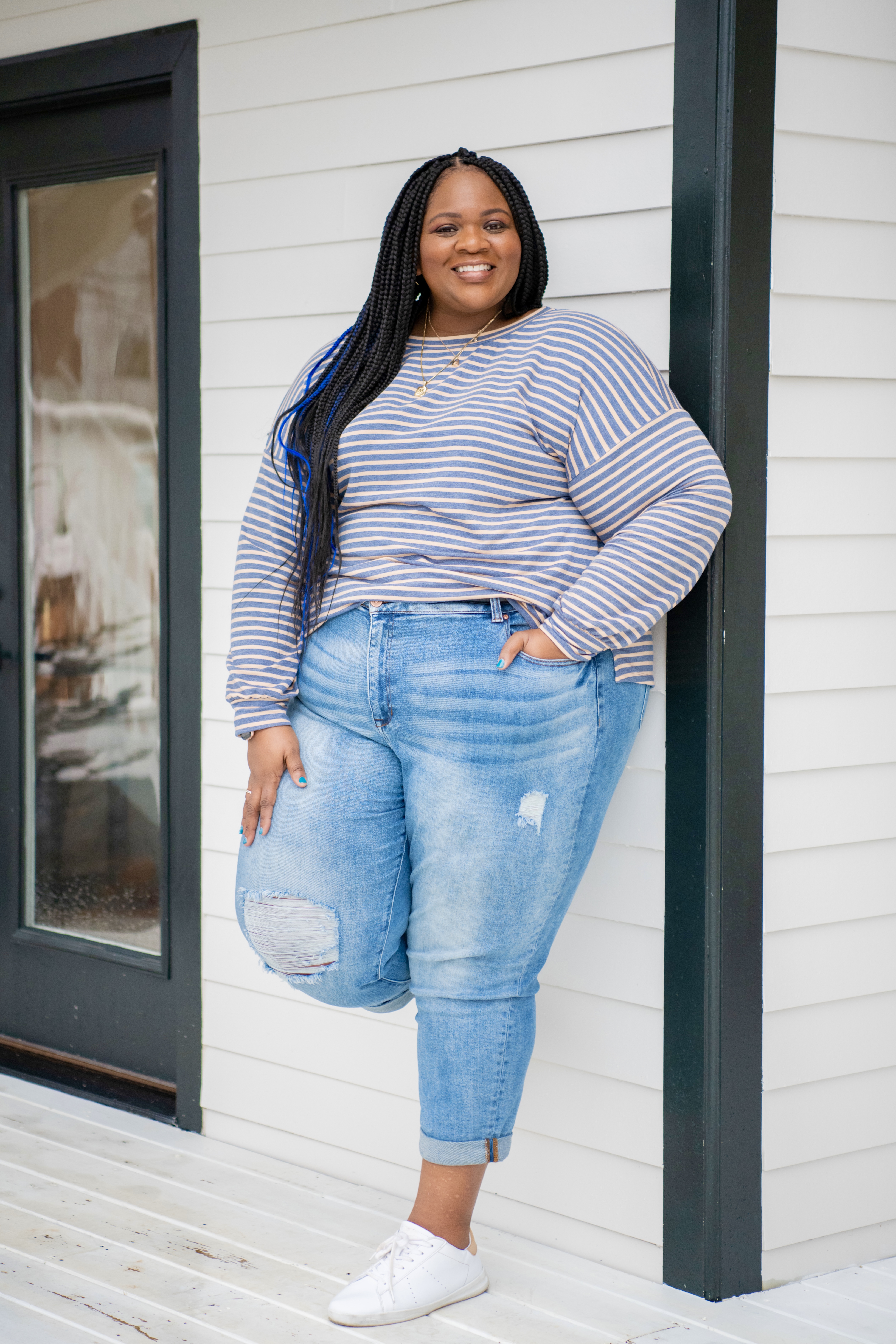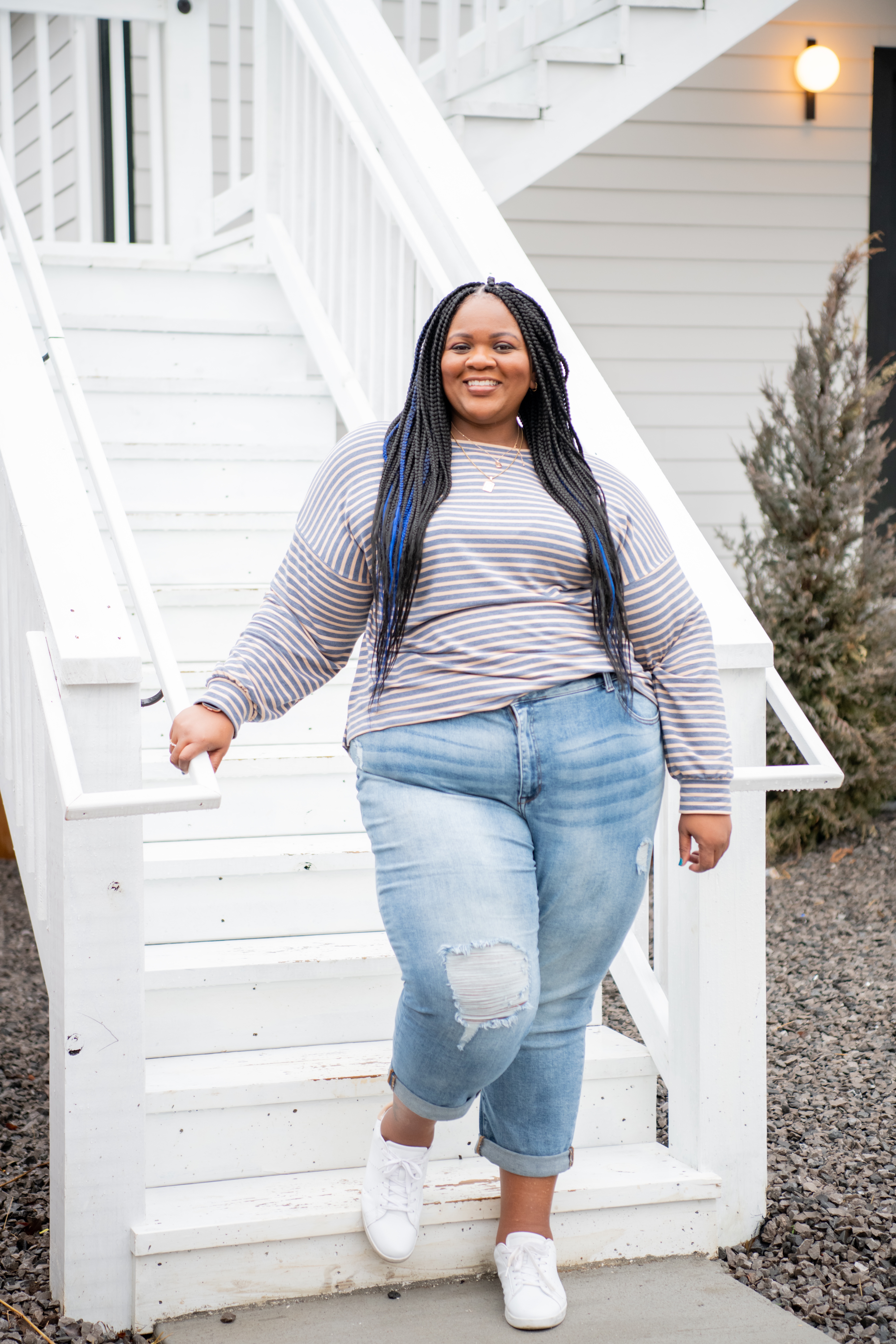 Y’all, these jeans are my new favorite jeans. And yo, who’s wearing JEANS to work from home? ME! I’m not a Jean girl, but these Acela Destructed Boyfriend Jeans have done their thing! I live the details AND love the length. Great transitional jeans for spring. I’m wearing a size 28, and could go down a size (truthfully).